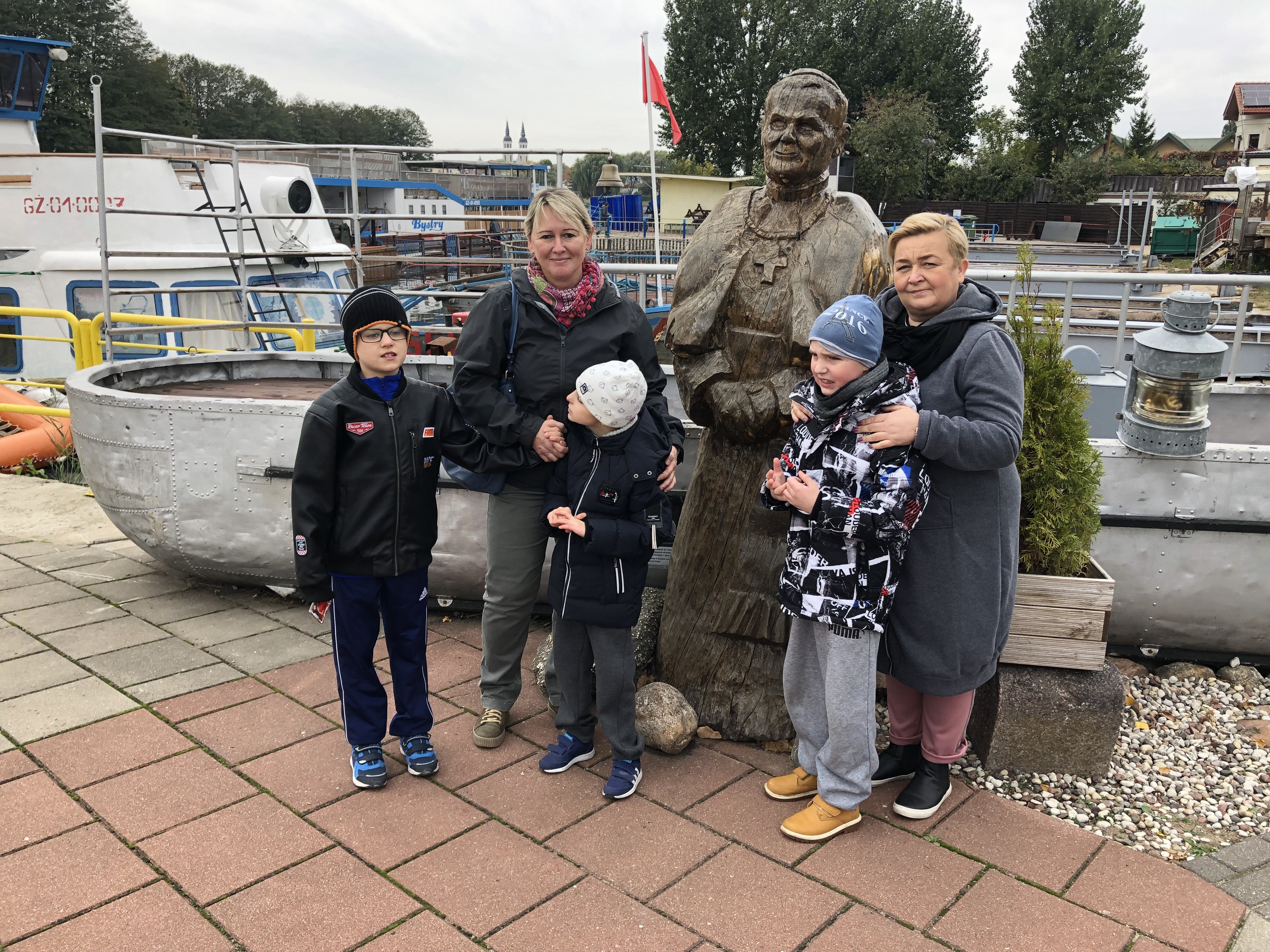 Natomiast 16 października cała społeczność szkolna wybrała się do Sanktuarium Matki Bożej Szkaplerznej w Studzienicznej. Wspólnie z uczniami i nauczycielami ze Szkoły Podstawowej im. Jana Pawła II w Żarnowie i Szkoły Podstawowej im. Jana Pawła II w Płaskiej oraz pensjonariuszkami Domu Pomocy Społecznej uczestniczyliśmy we Mszy świętej upamiętniającej 41 rocznicę wyboru kardynała Karola Wojtyły na papieża. Ksiądz Arkadiusz podczas kazania przypomniał wydarzenia dotyczące pielgrzymek papieża do ojczyzny, w tym również tej z czerwca 1999 roku, kiedy odwiedził studzieniczańskie sanktuarium. Uczniowie ze Szkoły Podstawowej w Żarnowie przygotowali piękną oprawę muzyczną w postaci zespołu gitarowego i chóru, a uczniowie z Płaskiej recytowali wiersze o naszym patronie. Po mszy świętej przeszliśmy do kaplicy Matki Bożej i pomnika Jana Pawła II. Zaśpiewaliśmy ulubioną pieśń Ojca Świętego „Barkę”, złożyliśmy kwiaty i zapaliliśmy znicze. Spotkanie zakończyło się wspólną Agapą w formie pikniku, przy stole z najdłuższej deski w Puszczy Augustowskiej. Serdeczne podziękowania składamy Radzie Rodziców za ufundowanie prowiantu na ognisko, księdzu Arkadiuszowi za słodkie drożdżówki, a szkole w Płaskiej za przepyszną grochów.