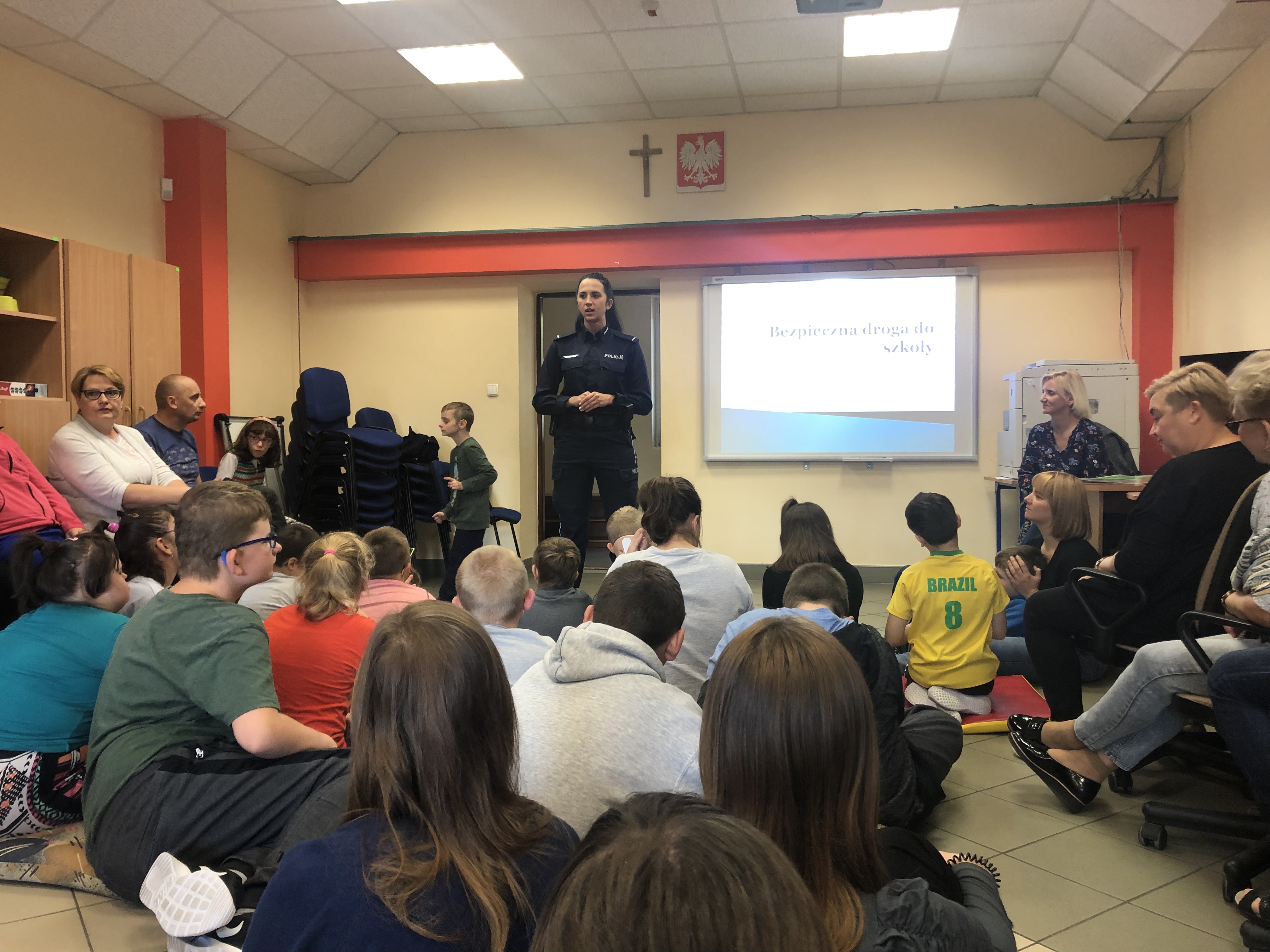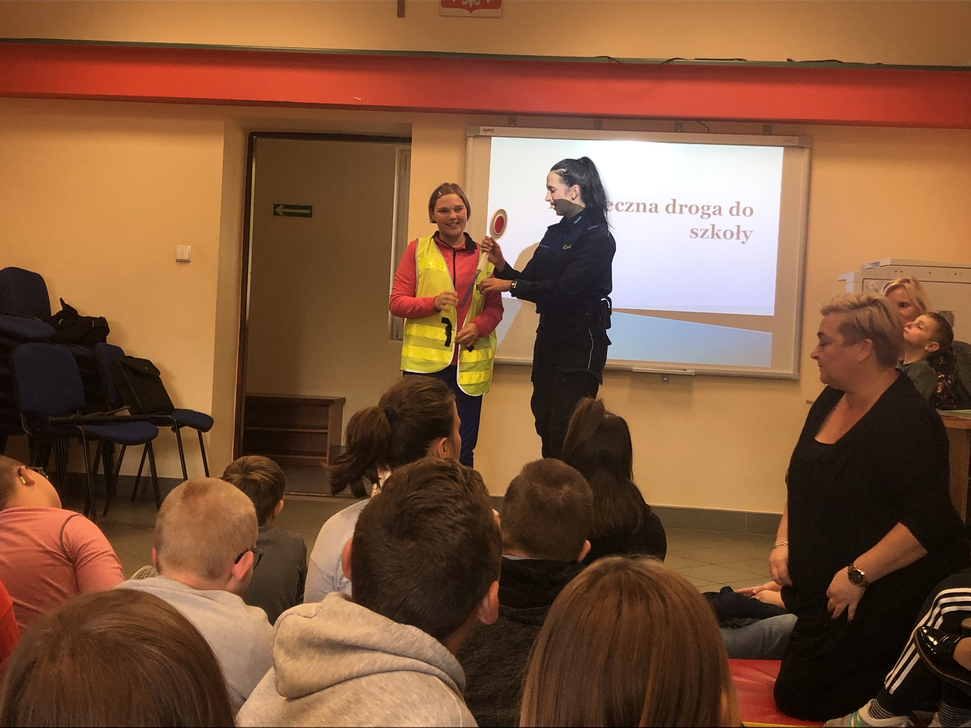 26 września odbyły się zajęcia otwarte na temat: „Bezpiecznej drogi do szkoły”. Na początku Pani Elżbieta Chilicka z Panią Agnieszką Szczygło omówiły prezentację multimedialną oraz przeprowadziły krótki konkurs ze znajomości znaków drogowych. Gościem specjalnym była funkcjonariuszka Powiatowej Komendy Policji w Augustowie – Pani Kinga Muczyńska. Policjantka przypomniała uczniom zasady bezpiecznego poruszania się pieszych w ruchu drogowym wyjaśniając przy tym jak wielkie ma to znaczenie dla naszego bezpieczeństwa. Omówiła również zasady zachowania się podczas ataku psa. W przyjaznej i miłej atmosferze uczniowie mieli okazję odświeżyć już posiadaną wiedzę oraz poznać nowe zagadnienia. Ponadto miały możliwość bliższego poznania specyfiki pracy Policjanta oraz wyposażenia, którym dysponuje na służbie. Podsumowaniem spotkania był krótki film.