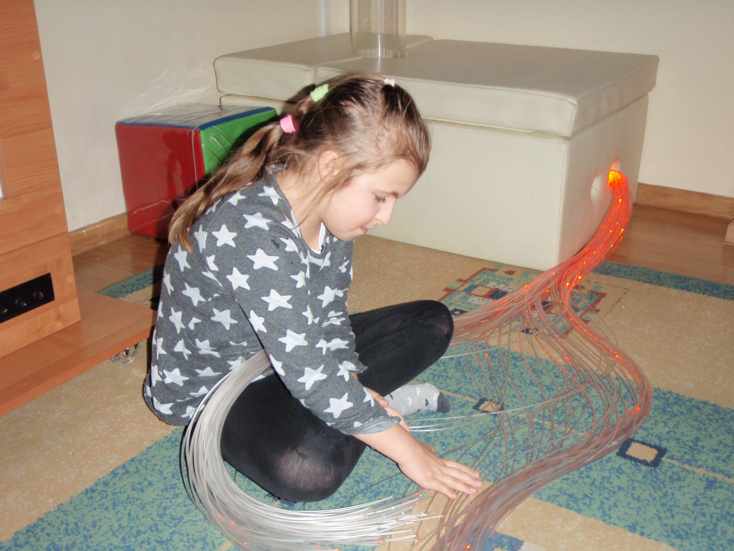 Stymulacja polisensoryczna to nauka wielozmysłowego doświadczania świata, która ma na celu wywołanie zaplanowanych wrażeń, uczuć. Nasze zajęcia mają za zadanie dostarczanie różnorodnych wrażeń zmysłowych – dotykowych, smakowych, węchowych, słuchowych, wzrokowych. Istotą naszych spotkań jest komunikacja i budowanie relacji międzyludzkich. Atrakcyjność i efektywność zajęć podnoszą urządzenia , w które została doposażona sala doświadczania świata, np .tablica świetlno-dźwiękowa.